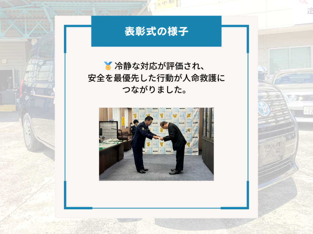 本所警察署からは、「交通量の多い時間帯の右側車線という極めて危険な状況の中、人命を守るために冷静で適切な対応を行った」点が高く評価され、感謝状が授与される運びとなりました。